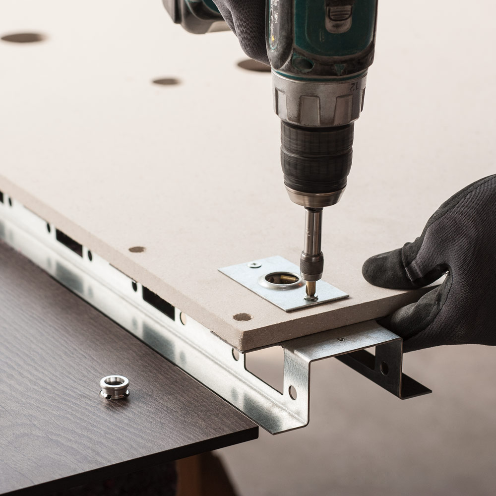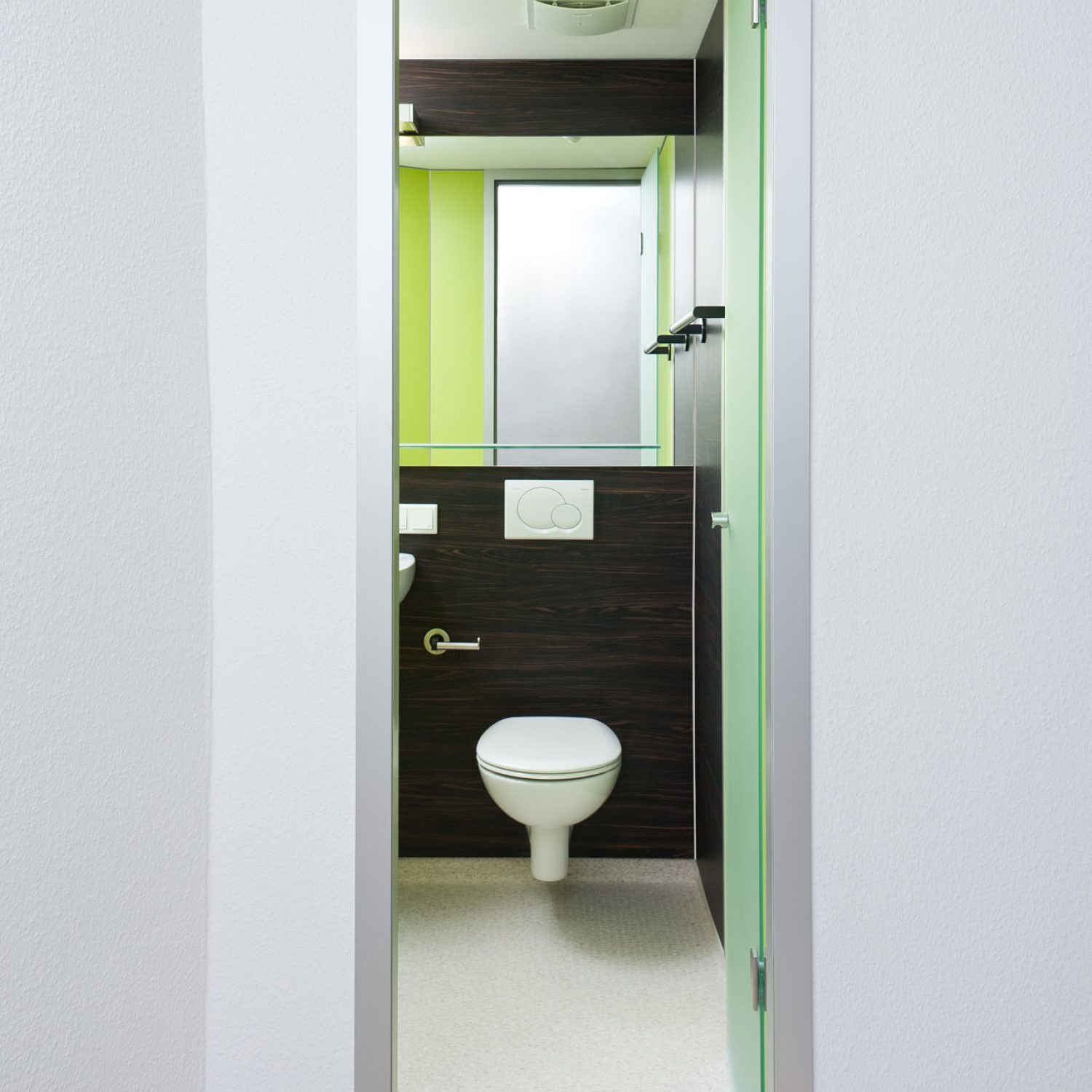 Die vorkonfektionierten Tragflächen aus Gipsfaserwerkstoff sowie die gleichfalls vorkonfektionierten Oberflächen aus HPL-Massiv dienen als Montageschablone und werden entsprechend der Planung mit allen Bohrbildern der Keramiken und Hilfsmittel angeliefert. Die intelligente Systemverbindung ist der Garant für eine schnelle Installation sowie für die schadensfreie Revision.